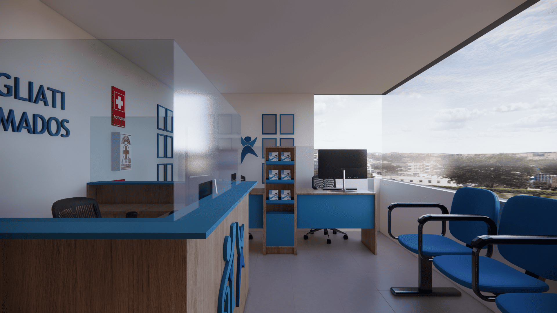 Diseñamos la recepción de las oficinas Rebagliati respetando fielmente los lineamientos de su identidad visual. Se utilizaron los colores institucionales para transmitir profesionalismo y coherencia de marca, logrando un espacio moderno, ordenado y funcional que brinda una excelente primera impresión a visitantes y colaboradores.