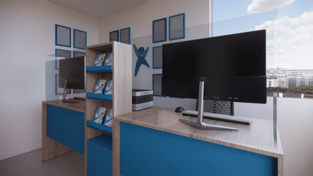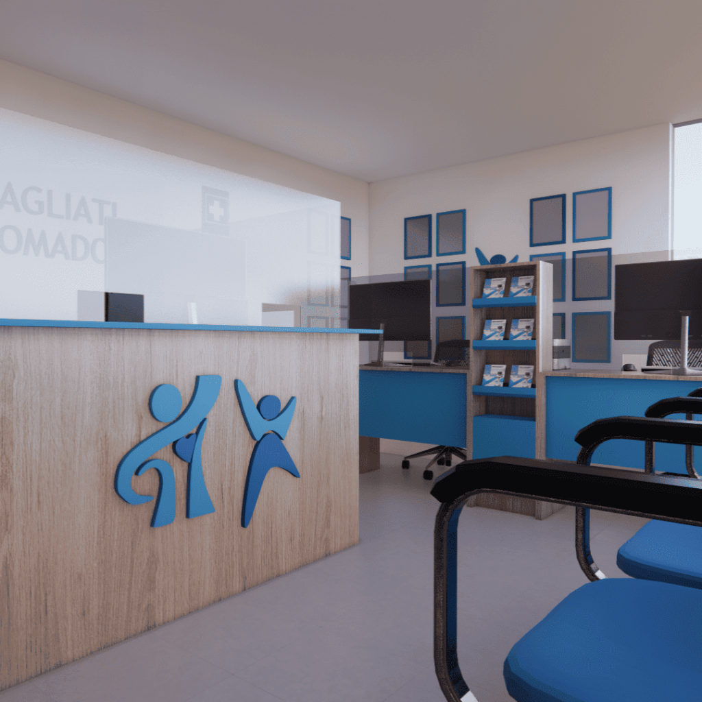 Diseñamos la recepción de las oficinas Rebagliati respetando fielmente los lineamientos de su identidad visual. Se utilizaron los colores institucionales para transmitir profesionalismo y coherencia de marca, logrando un espacio moderno, ordenado y funcional que brinda una excelente primera impresión a visitantes y colaboradores.